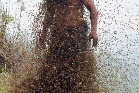 Esta foto del 9 de abril de 2014 muestra a She Ping, un apicultor de 34 años de Chongqing (China), cubierto de un ejambre de abejas en una pequeña colina. Liberó a más de 460.000 abejas y las atraje a su cuerpo, construyéndose un traje de 4...