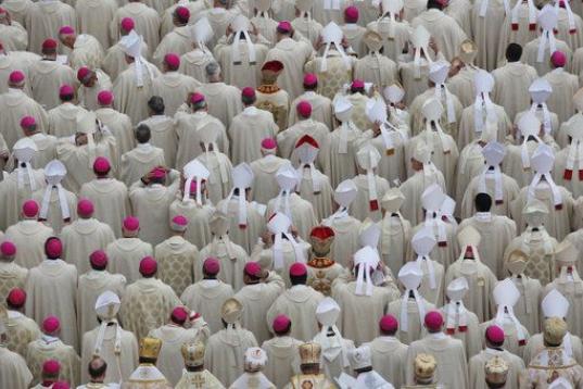 Los obispos asisten a la canonización de los papas Juan XXIII y Juan Pablo II en la catedral de San Pedro el 27 de abril de 2014 en la Ciudad del Vaticano. Dignatarios, jefes de Estado y realeza europea acudieron a la cita.