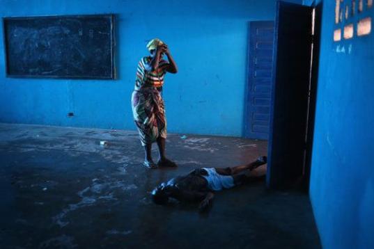 Omu Fereneh llora junto al cuerpo caído de su marido Ibrahim, que se desplomó inconsciente en un ala hospitalaria de ébola en Monrovia (Liberia) el 15 de agosto de 2014.