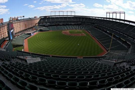 Los Baltimore Orioles y los White Sox de Chicago se levantan para recibir el himno nacional en un estadio vacío en Camden Yards el 29 de abril de 2015 en Baltimore. Debido a las protestas por el arresto y la muerte de Freddie Gray, ambos equipo...