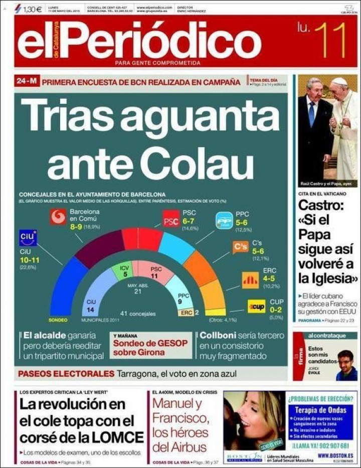 "Trias aguanta ante Colau", proclama en primera El Periódico de Cataluña, que nos ofrece un reparto en el Ayuntamiento de Barcelona en el que Convergencia obtendría entre 10 y 11 concejales y Barcelona en Comú de 8 a 9. La campaña en Barcelona está que arde, señala La Vanguardia, tras el mitin del sábado de Colau y Pablo Iglesias en el que la candidata hizo un llamamiento a elegir entre "la mafia y la gente, entre CiU y Podemos".