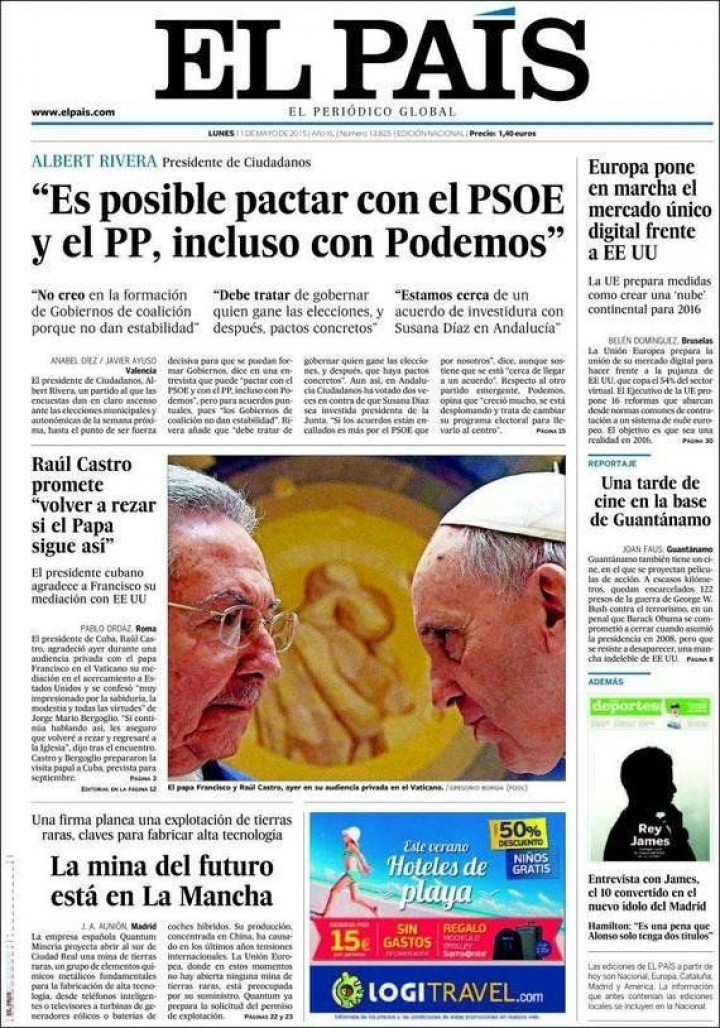 "Si el papa sigue así, volveré a rezar", titula ABC en primera sobre una foto de Raúl Castro y el papa Francisco que, a juicio de El País, "ha colocado a la Iglesia entre los protagonistas del cambio que se avecina en Cuba". Castro pronunció la frase tras entrevistarse con el primer ministro italiano, Matteo Renzi, y hoy llega a la isla François Hollande que, en un fotomontaje, aparece como el Ché en la primera de Libération.