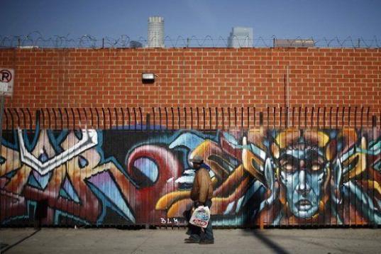 Un hombre pasa junto a un mural en el centro de Los Ángeles, California.