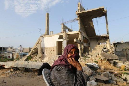 Una mujer palestina se sienta cerca de su casa, que según testigos fue destruida por los bombardeos israelíes durante una guerra de 50 días el verano pasado, en Khan Younis, al sur de la Franja de Gaza.