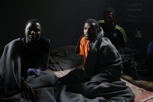 Inmigrantes en situación irregular se sientan en un centro de detención de inmigración en la ciudad de Garabulli, Libia.