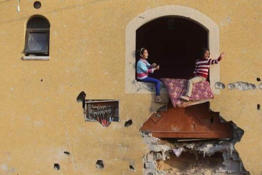 Niñas palestinas juegan en la casa de su familia, que según testigos fue dañada por los bombardeos israelíes durante una guerra de 50 días el verano pasado, en Khan Younis, en el sur de la Franja de Gaza.
