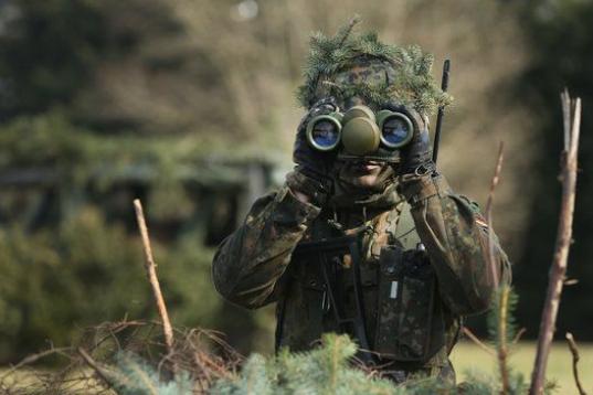 Un miembro del batallón de infantería 371 del ejército alemán mira a través de unos prismáticos durante un evento de medios de comunicación en la base del batallón en Marienberg , Alemania .
