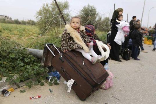 Una niña palestina se sienta en una maleta mientras espera con su familia viaje para cruzar a Egipto, en el cruce de Rafah entre Egipto y el sur de la Franja de Gaza.