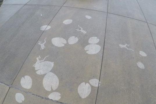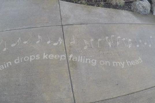 Sus dibujos no dañan las aceras ni las hacen más resbaladizas, por lo que a la buena acogida de los habitantes de Seattle se suma la de las autoridades. Su creación favorita es este dibujo circular sobre el ciclo del agua de seis metros de diámetro.
