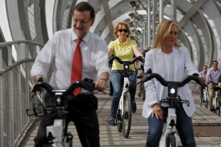 El presidente del Gobierno recorrió 200 metros en bici eléctrica junto a Cristina Cifuentes y Esperanza Aguirre, candidatas a la presidencia y el ayuntamiento de Madrid.