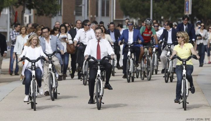 Como si fuera la ascensión al Tourmalet, el presidente del Gobierno, Mariano Rajoy, lo ha dado ¿todo? sobre la bici en las calles de Madrid para apoyar en la campaña a las candidatas del PP a la Alcaldía de la capital, Esperanza Aguirre, y a la Presidencia de la Comunidad, Cristina Cifuentes.