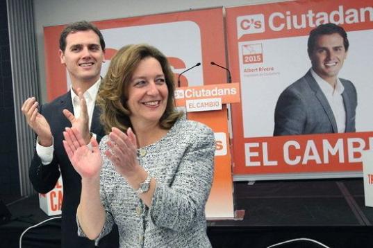 El presidente de Ciudadans, Albert Rivera, junto a la candidata del partido a la Alcaldía de Barcelona, Carina Mejías, en la cena con militantes en Barcelona con que Ciudadanos.