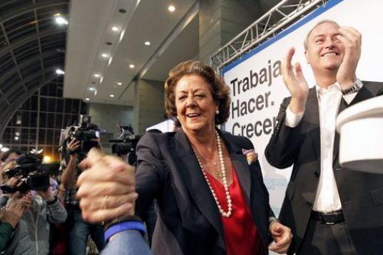 Rita Barberá, candidata del PP al Ayuntamiento de Valencia, y Alberto Fabra, candidato a la Comunidad Valenciana, en el acto de inicio de campaña de su partido en Valencia.