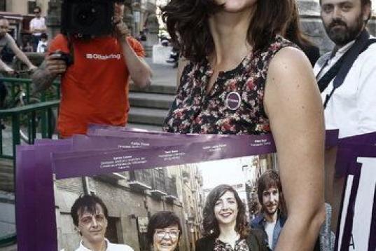 La candidata de Podemos a la presidencia del Gobierno de Navarra, Laura Pérez, durante la tradicional pega de carteles en el Paseo Sarasate de Pamplona.