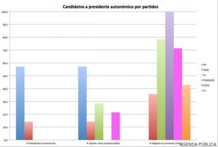 Para el común de los mortales es difícil comprender las grandes diferencias que separan a Ciudadanos de UPyD. Lo mismo pasa con sus candidatos, que tienen medias de edad parecidas (40 y pocos), similares porcentajes de mujeres (menos del 30%), igual bisoñez institucional y cifras afines de licenciados en Derecho. Por cierto, en esto ambos partidos están muy por encima de los candidatos del PP. En lo que sí son distintos es en el uso que han hecho de las primarias. Mientras UPyD ha seleccionado a casi todos sus presidenciables autonómicos mediante este método, Ciudadanos sólo lo ha hecho en poco más del 40% de los casos. La otra diferencia es que UPyD está en crisis y ha tenido que cambiar a última hora a cerca del 30% de sus presidenciables autonómicos mientras que Ciudadanos es la sensación del momento.