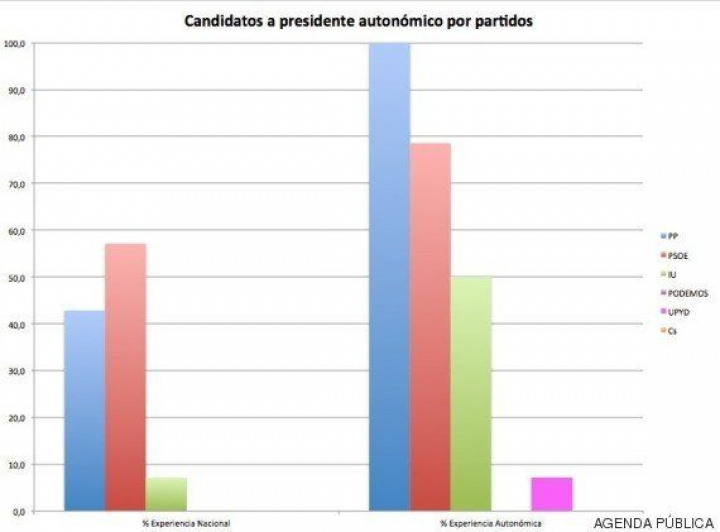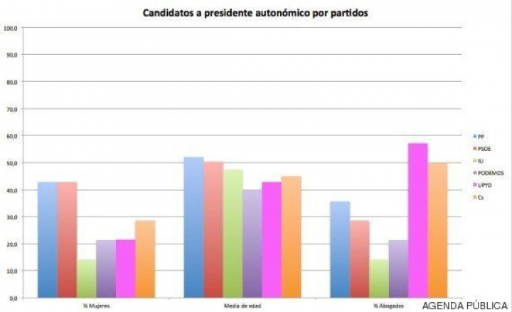 Podemos comparte con Ciudadanos y UPyD su falta de experiencia institucional. Esto le sitúa en una excelente posición para captar el voto de protesta de la izquierda. Sus candidatos son los más jóvenes de todos los partidos (39 años de media) y, además, es el único partido que ha aplicado a rajatabla las primarias como proceso de selección de sus presidenciables autonómicos (de hecho, para toda la lista). Aunque tienen más licenciados en derecho (21%) que IU, lo más destacado es la notable presencia de candidatos con formación en ciencias sociales. Una consecuencia indeseada de las primarias ha sido, sin embargo, la baja presencia de mujeres (21%) como cabezas de lista. De momento esto ha sido compensado, en parte, por el protagonismo de Teresa Rodríguez en Andalucía.