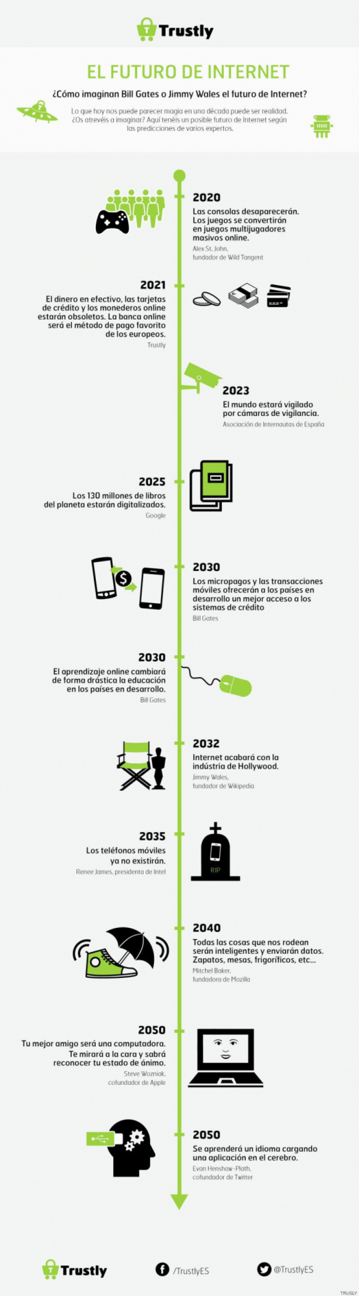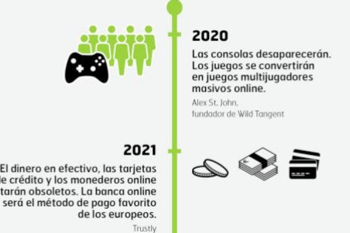 Para bien (o para mal), todo ha cambiado en este tiempo y va a a seguir haciéndolo. ¿Y cómo va a ser la evolución? Eso es algo que el tiempo dirá, aunque lo cierto es que muchos ya han empezado a especular, incluidos los expertos en la materia. Bill Gates, Jimmy Wales, Renee James... tienen sus propias predicciones. En esta infografía de la compañía de transferencias Trustly se recogen algunas de las más llamativas. Los móviles podrían desaparecer en 2035 y en 2023 las cámaras vigilarán el mundo.