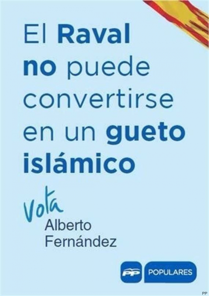 El PP de Barcelona repartió el martes en la Rambla del Raval durante un acto de campaña electoral de su candidato al Ayuntamiento Alberto Fernández, panfletos electorales con el mensaje: "El Raval no puede convertirse en un gueto islámico".