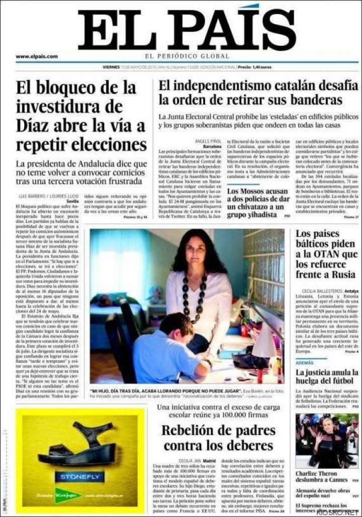 "Rebelión de padres contra los deberes", anuncia El País en primera al hacerse eco de "una iniciativa contra el exceso de carga escolar que ha recogido ya 100.000 firmas". Su impulsora, Eva Bailén, explica "yo no era contraria a los deberes, pensaba que era bueno que hiciera algo. Hasta que ves que tu hijo día tras día acaba llorando, que no ha podido jugar, que no es feliz". Los expertos consultados coinciden en los males del sistema español: "tareas excesivas, repetitivas e iguales para todos".