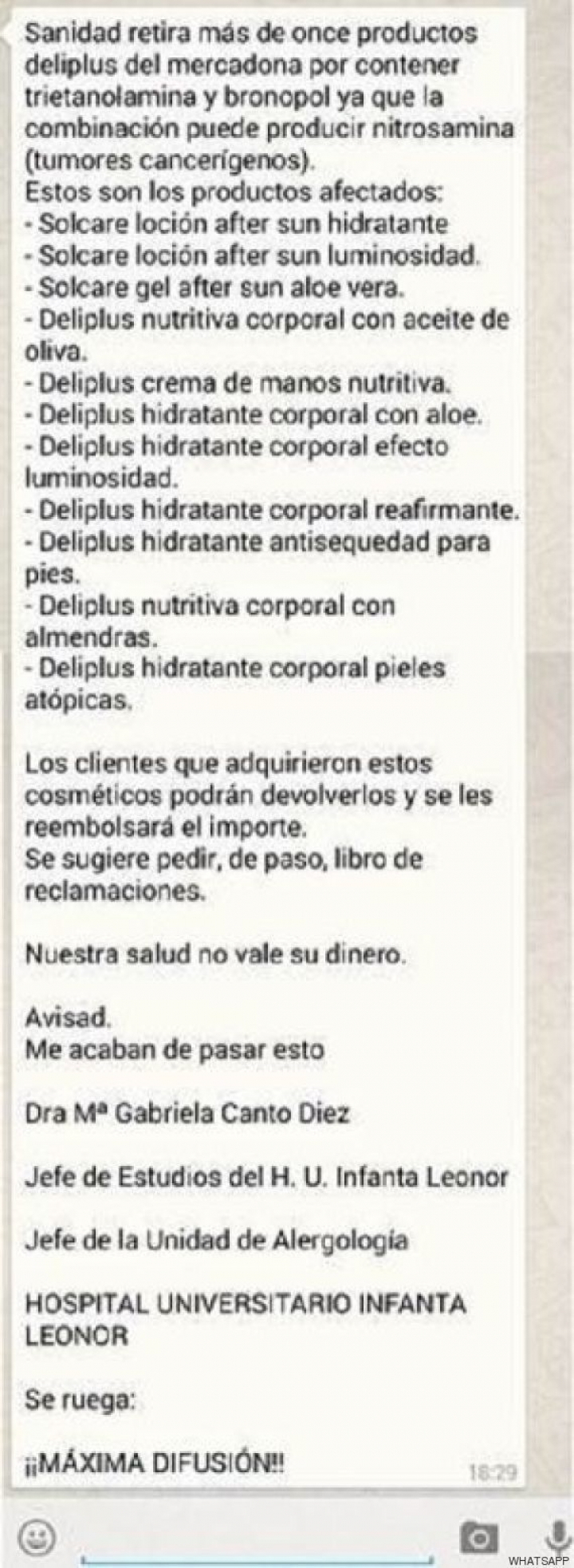 Es cíclico. Cada poco aparecen mensajes falsos alertando ante los riesgos del consumo de tal o cual producto o marca. Ahora, otra vez, le ha tocado a Mercadona. La Unión de Consumidores de Andalucía-UCA/UCE informa de que ha recibido numerosas consultas para solicitar aclaración sobre la difusión de un WhatsApp que alerta de que el Ministerio de Sanidad está retirando algunas de las cremas que comercializa Mercadona.