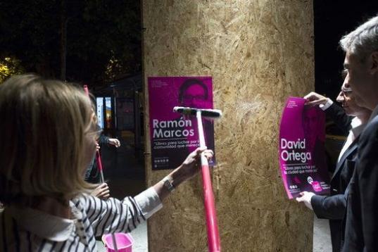 Rosa Díez, David Ortega y Marcos, en la pegada de carteles