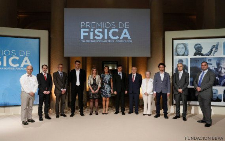 De izquierda a derecha: Javier Galeano, premio al Mejor artículo de Enseñanza en las publicaciones de la Real Sociedad Española de Física (RSEF); Juan José Serrano, premio al Mejor artículo de Investigación en las publicaciones de la Real Sociedad Española de Física (RSEF); Alejandro del Mazo, premio Enseñanza y Divulgación de la Ciencia (Enseñanza Media); Pablo Alonso, premio Investigador Novel en Física Experimental; Susana Marcos, premio de Física, Innovación y Tecnología; Carmen Vela, secretaria sde Estado de de Investigación, Desarrollo e Innovación; Rafael Pardo, director de la Fundación BBVA; José Adolfo de Azcárraga, presidente de la Real Sociedad Española de Física (RSEF); María Josefa Yzuel, Medalla de la Real Sociedad Española de Física (RSEF); Vicent Mateu, premio Investigador Novel en Física Teórica; Agustín Sánchez, premio Enseñanza y Divulgación de la Física (Enseñanza Universitaria) y Rafael Vida, premio al Mejor artículo de Enseñanza en las publicaciones de la Real Sociedad Española de Física (RSEF).