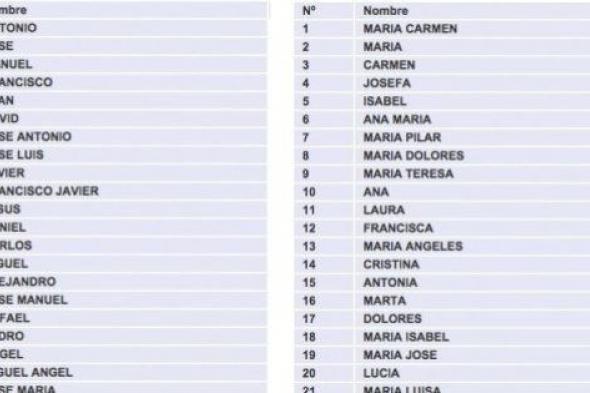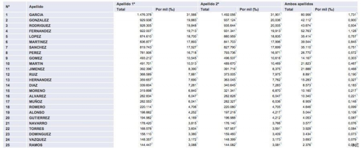 Estos son los 25 primeros nombres de la lista para hombres y mujeres, y los 25 primeros apellidos, y más abajo encontrarás los 100 nombres más frecuentes de mujeres y de hombres en España, por separado.