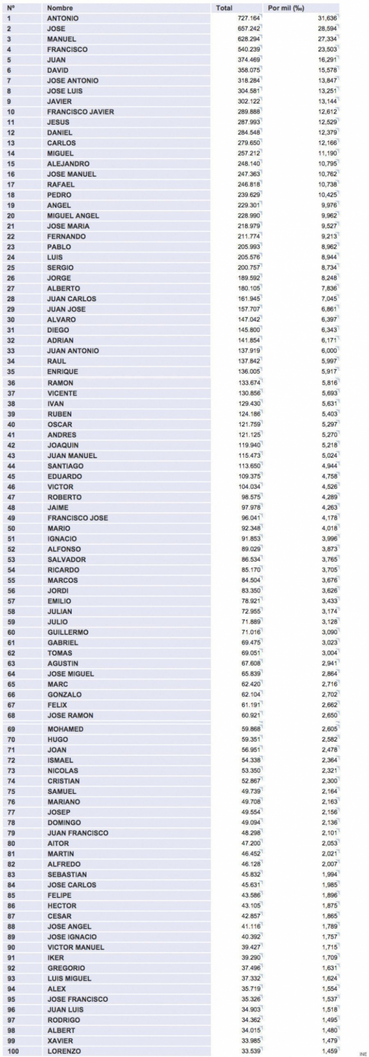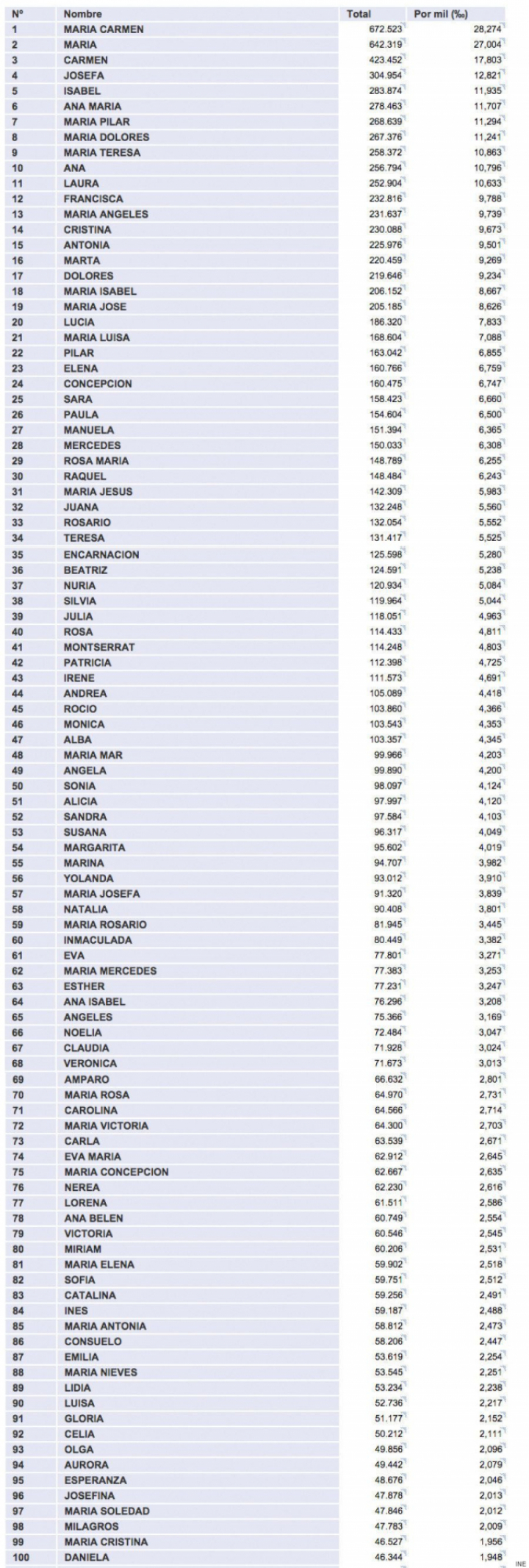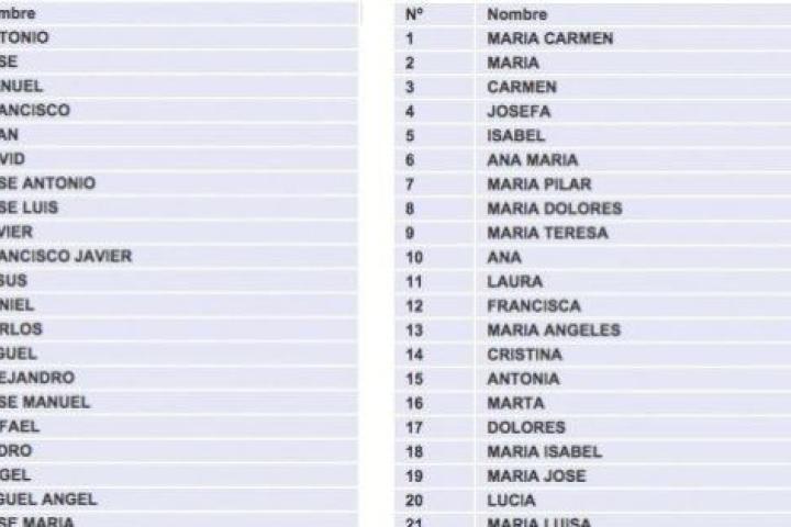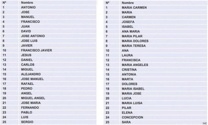 El Instituto Nacional de Estadística (INE) ha publicado la lista de los 100 nombres más frecuentes de hombres y mujeres en España según datos de 2013. Y no: ni María ni Ana son los primeros en mujeres, ni José o Juan en hombres. El nombre más común en las mujeres españolas es compuesto: María Carmen, que figura en el carné de identidad de más de 672.000 mujeres, 28 de cada mil, seguido por María, Carmen, Josefa e Isabel. Entre los hombres, el más frecuente es Antonio, que tienen más de 727.000 hombres, 36 de cada mil. Tras él, Jose, Manuel, Francisco y Juan. El Top 100 lo cierran, para ellas, Daniela, y para ellos, Lorenzo. Además, el INE permite ver las listas completas y seleccionar por provincia de nacimiento y residencia, edad y nacionalidad.