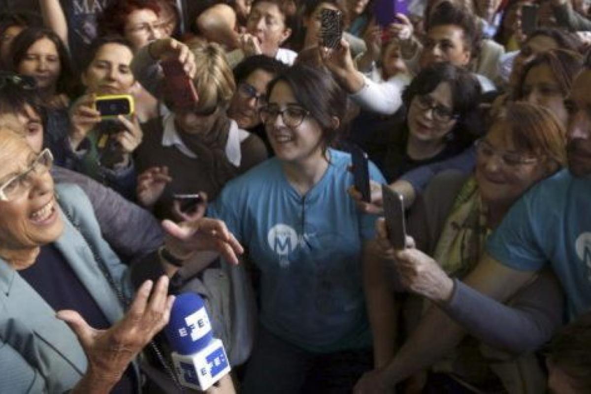 Abarrotado. Manuela Carmena, candidata de Ahora Madrid al Ayuntamiento, ha tenido que salir este jueves a disculparse ante las más de 1.500 personas que no habían conseguido entrar en el céntrico cine Palafox de la capital para participar en un acto del partido. Dentro había cerca de 800 personas.