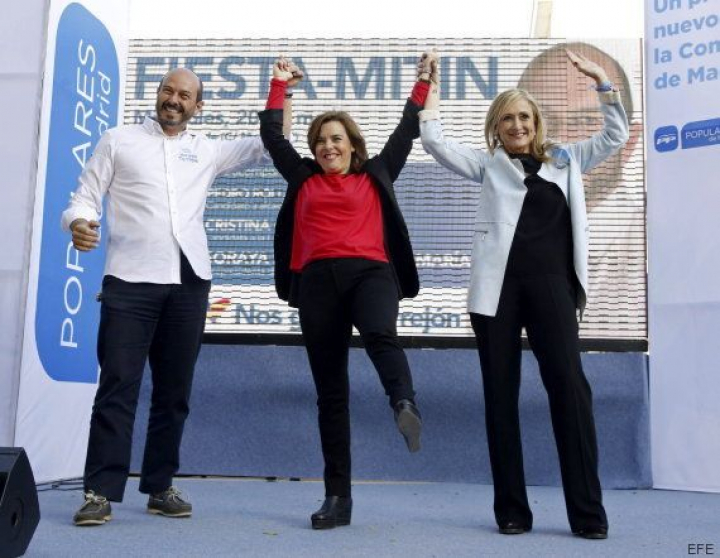 La candidata del PP a la Presidencia de la Comunidad de Madrid, Cristina Cifuentes (d), junto a la vicepresidenta del Gobierno, Soraya Sáenz de Santamaría (c), y el candidato a la alcaldía de Torrejón de Ardoz, Pedro Rollán,