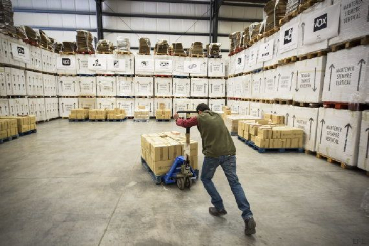 Un operario traslada cajas en el almacén central del material electoral de la Comunidad madrileña, coordinado por el Servicio de procesos electorales de la Delegación del Gobierno en Madrid y ubicado en Alcalá de Henares, que guarda las urnas, papeletas, impresos para que todo esté preparado en los colegios electorales el 24M.
