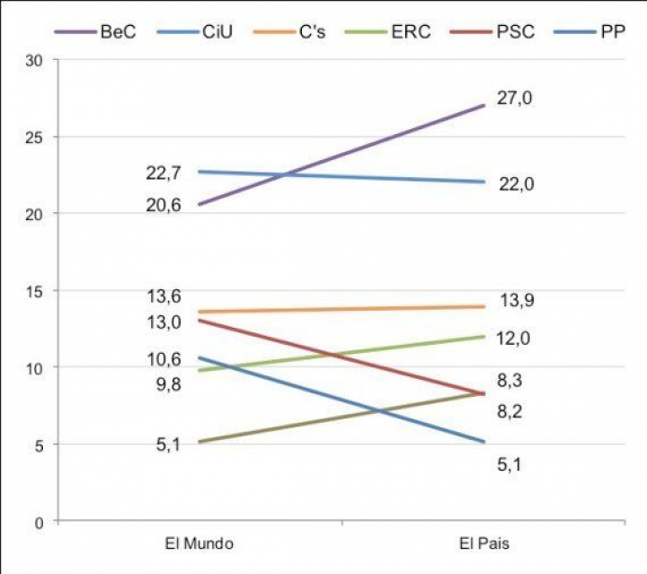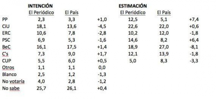 Los datos de ambos sondeos (realizados por Metroscopia y Gesop, respectivamente) muestran un gran parecido en las intenciones directas de voto. En el sondeo de El Periódico se percibe una mayor presencia de voto a las formaciones nacionalistas que en El País (+4,5% para CiU y +2,8% para ERC), pero el resto está dentro del margen de error. Ahora bien, las similitudes en la intención directa se vuelven diferencias cuando entra en función la cocina. Así, a pesar de las diferencias en intención, ambos sondeos otorgan a CiU una estimación muy similar (22,6% y 22%), mientras que difieren sobre el resultado final de Barcelona en Comú, PSC y PP. A la candidatura que lidera Ada Colau Metroscopia le supone un resultado ocho puntos por encima que Gesop, mientras que PSC y PP obtienen una mayor estimación (+6,4% y +7,4%, respectivamente).