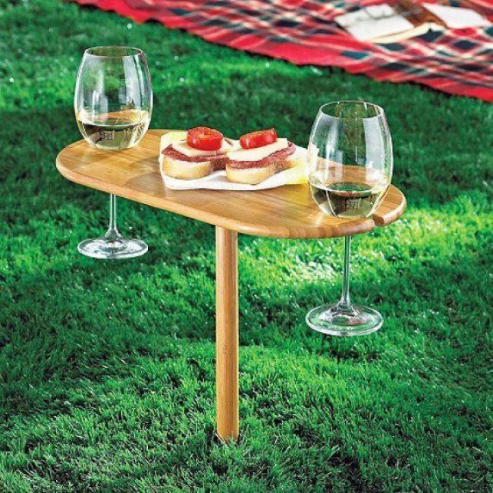Para aquellos que quieren disfrutar de un buen vino y queso en medio del campo sin tener que preocuparse por posibles derrames y manchas. Esta mesa portátil preparada para clavarse en la tierra asegura un brindis para dos. El producto se llama Toast-for-Two y es fácil de encontrar en internet.