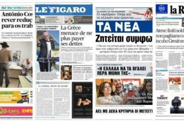 Bajo el título "Shock y pavor para el partido popular de Rajoy en las elecciones municipales", el rotativo centrista griego To Vima habla de un "giro a la izquierda". "El partido de Rajoy se dirige hacia un desplome y pierde Madrid en la elecciones municipales" es el título del diario de centro Ta Nea.