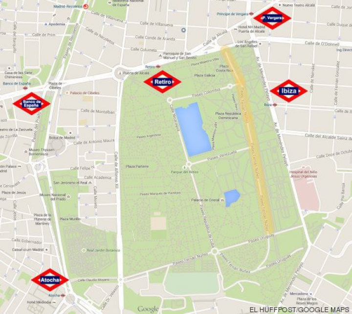 Aquí tienes un plano del lugar, y justo abajo puedes ver que si vas en transporte público las mejores entradas son las de Ibiza (situada en un lateral de la Feria) y la de Retiro (con la que empezarás justo por el principio de los puestos), y tampoco está mal la de Príncipe de Vergara, en la esquina. Si vas en tren, Atocha es una buena opción, aunque hay que caminar un poquito más.