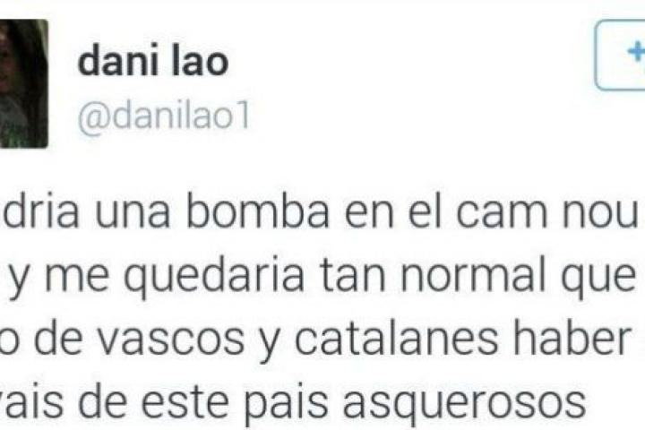 Además del fútbol, de nuevo, la violencia dialéctica. La pitada del himno español en la final de la Copa del Rey llevó a que decenas de tuiteros lanzasen mensajes deseando que cayera "una bomba en el Camp Nou", y variantes similares, todas igualmente deleznables.