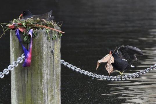 Un ave camina sobre una cadena mientras lleva material para construir el nido de su compañero en el lago Serpentine en Londres, Inglaterra.