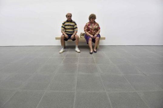 Una escultura llamada 'Pareja de ancianos en un banco', hecha por el artista estadounidense Duane Hanson, se exhibe en la galería Serpentine Sackler en Londres, Inglaterra.