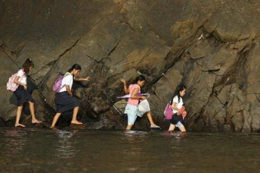 Una mujer acompaña a algunas estudiantes caminando por el agua en una playa camino de la escuela para ir a su primer día de clase en un pueblo al norte de Manila, Filipinas.