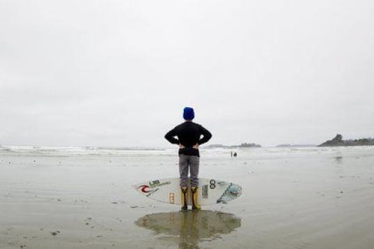 El surfista Reed Platenious sujeta una tabla durante el campeonato de surf canadiense en Tofino, Canadá.