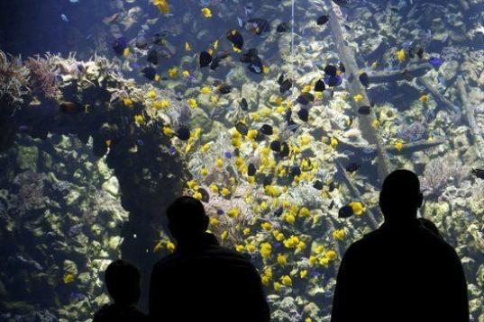 Visitantes miran los peces en el acuario del zoo de Antwerp, Bélgica.