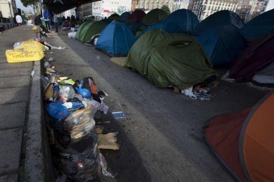 Vista de las tiendas de campaña en un campamento de inmigrantes bajo las vías del metro de París en el Boulevard de la Chapelle.