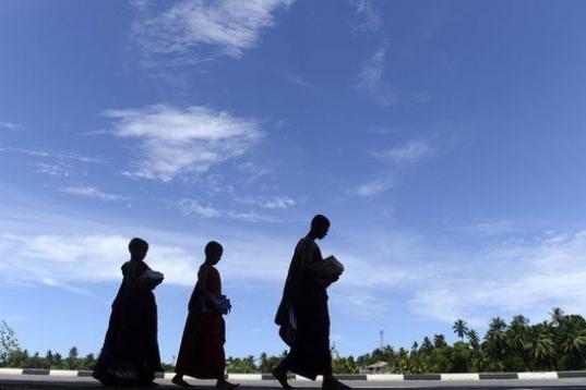 Monjes budistas de Sri Lanka caminan por la carretera en Piliyandala, un suburbio de Colombo.