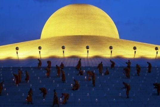 Monjes budistas encienden velas durante el día de Vesak, una celebración anual en recuerdo de Buda, en el templo Wat Dhammakaya en la provincia de Pathum Thani, a las afueras de Bangkok, Tailandia.