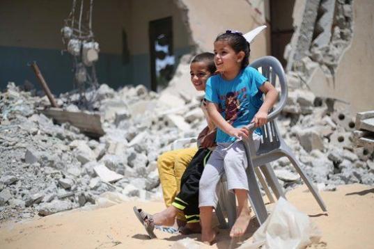 Dos niños palestinos se sientan entre los escombros de los edificios que fueron destruidos en la guerra de 50 días entre Israel y militantes de Hamás durante el verano de 2014 en el pueblo de Khuzaa, al sur de la Franja de Gaza.