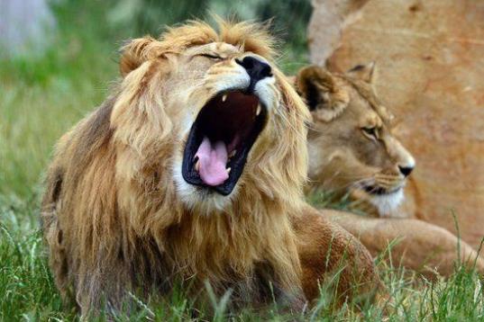 Un león bosteza en el zoo de Erfurt, Alemania.