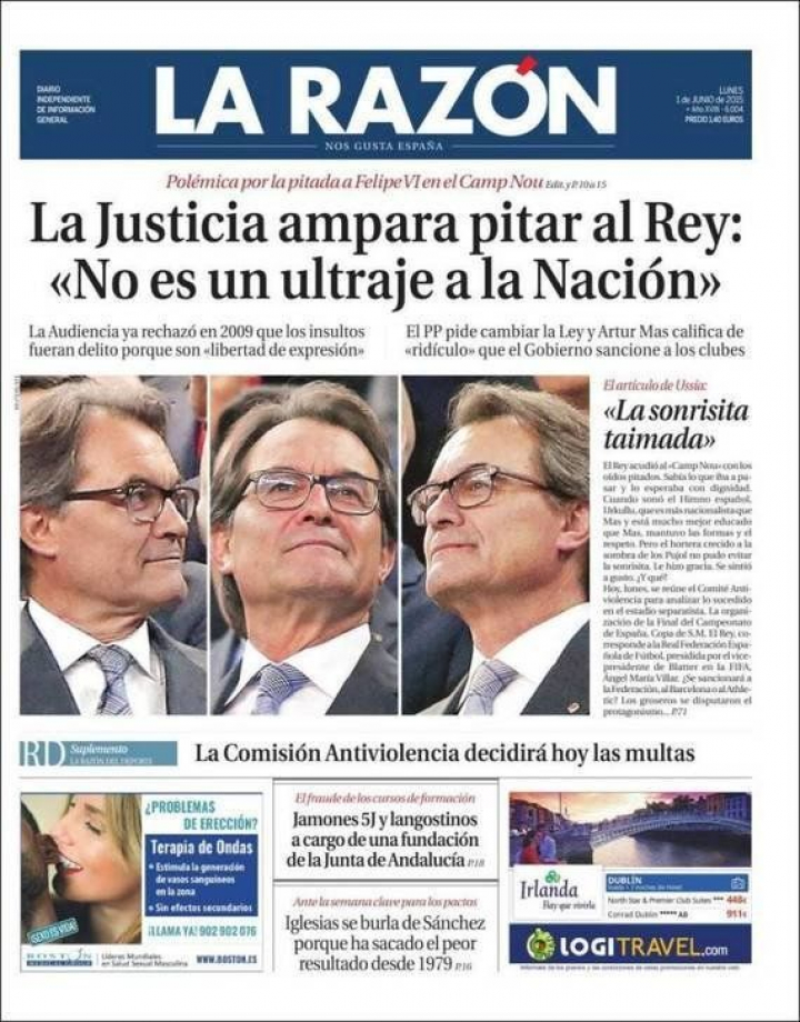 No obstante, tiene dudas sobre la intención del Gobierno de penalizarlas porque se atentaría contra la libertad de expresión. De hecho, La Razón recuerda que la Audiencia Nacional, en 2009, ya rechazó que "pitar al Rey" fuera un ultraje a la nación y muestra una serie de fotos de Artur Mas, en cuyo rostro cree ver lo que denomina "sonrisa taimada".
