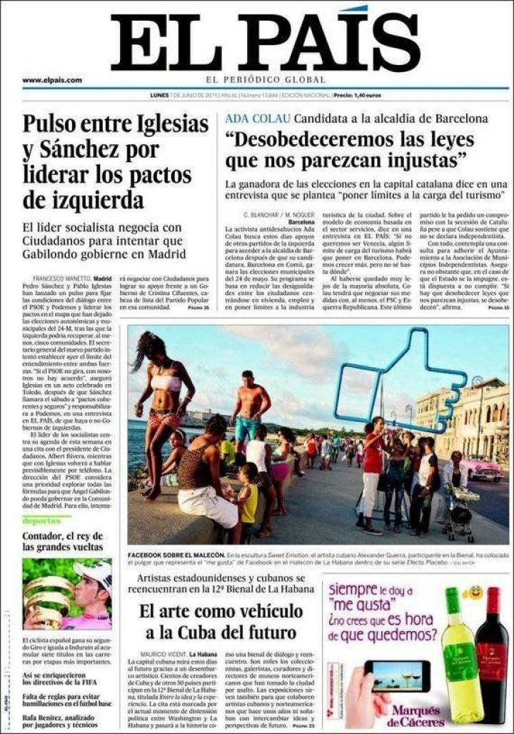 "Pulso entre Iglesias y Sánchez por liderar los pactos de izquierda" es la apertura de El País que, además, nos aclara que "el líder socialista negocia con Ciudadanos para intentar que Ángel Gabilondo gobierne en Madrid". Este intento de apoyarse en los dos partidos emergentes se justifica aún más si se tienen en cuenta otras dos informaciones en el mismo diario: una, que en Andalucía, el PSOE eleva el listón a Podemos; y dos, que "Podemos pretende aglutinar a toda la izquierda en las generales".