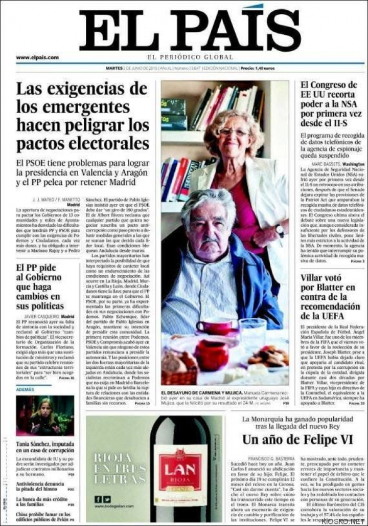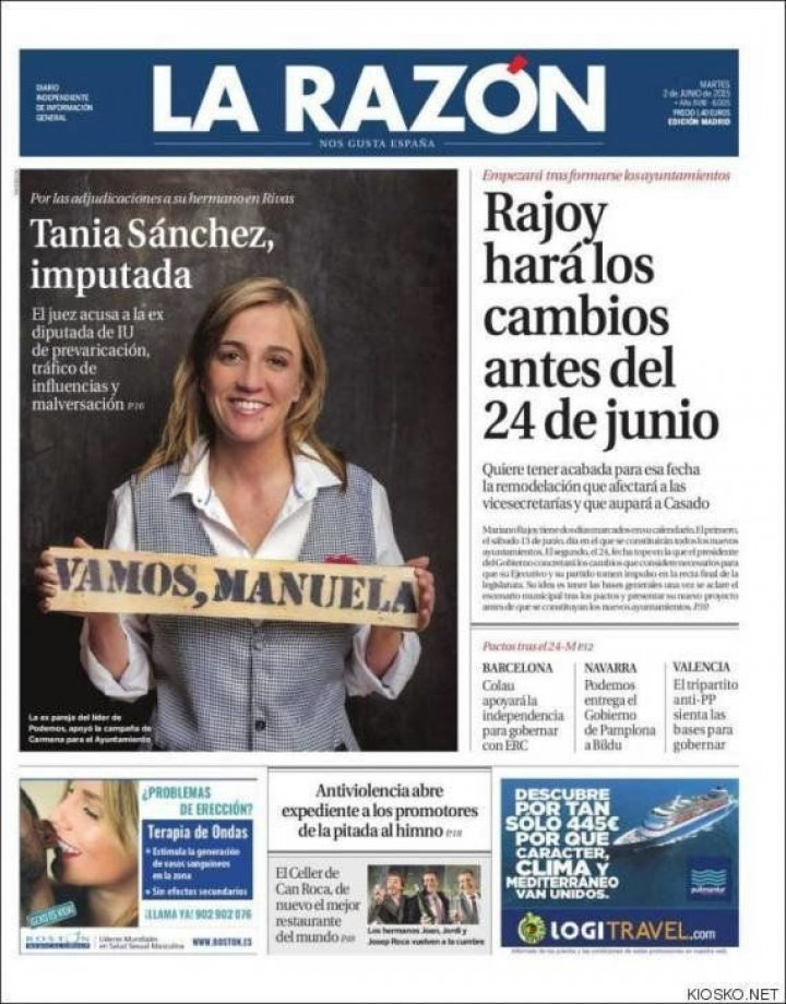Tania Sánchez, sonriente, muestra un cartel de apoyo a Manuela Carmena. Es la imagen elegida por La Razón para anunciar que la exdiputada de Izquierda Unida ha sido imputada por "las adjudicaciones a su hermano en Rivas". El golpe bajo a Carmena en la cara de Tania contrasta con la serenidad que refleja la candidata de Ahora Madrid -en la primera de El País- junto al expresidente de Uruguay, José Mujica, con el que ayer desayunó. En ABC, Ada Colau, de perfil y sumergida en un efecto psicodélico, es acusada de venderse al independentismo porque "una semana de negociaciones con Esquerra ha bastado a la populista catalana para volverse una aliada real del proceso separatista". ¡Juego limpio!, reclama Miguel Ángel Aguilar en su columna de El País porque "los comicios han sido impecables" y esto obliga a dar la bienvenida a quienes llegan por primera vez y a congratularse de que los electores hayan penalizado a los corruptos en vez de convalidar sus latrocinios.