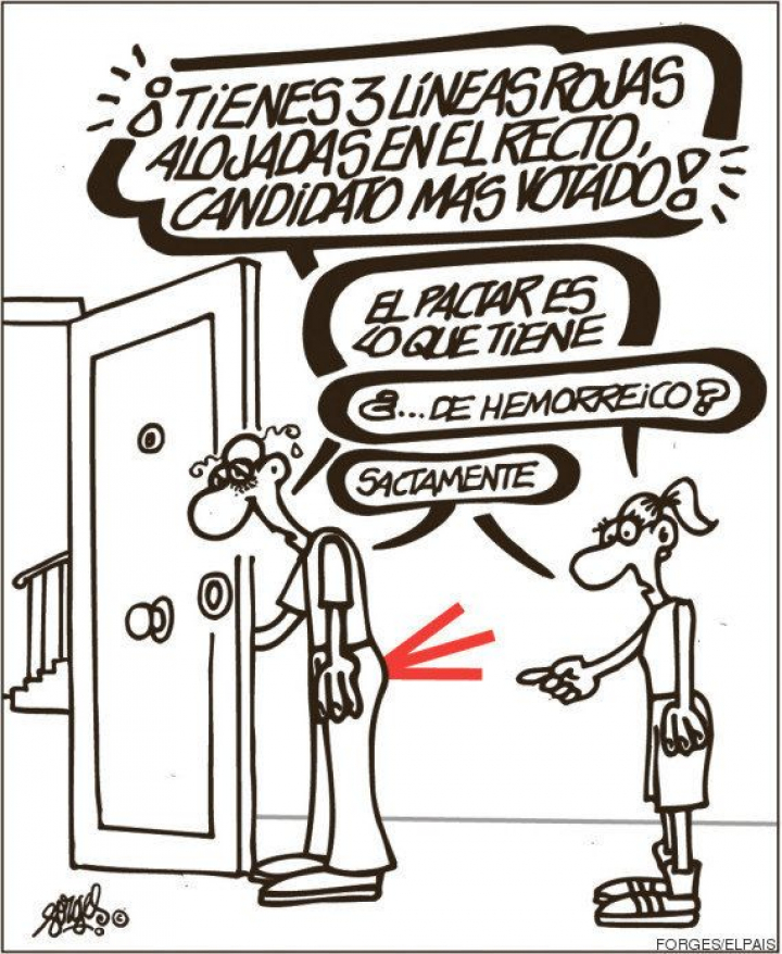 Lo mejor es tomarse las negociaciones con una sonrisa y para ello, Forges. En su viñeta, un ojeroso Blasillo, ya crecidito, es advertido en la puerta de su casa por su compañera: "Tienes tres líneas rojas alojadas en el recto, candidato más votado". "El pactar es lo que tiene", responde fatigado. Como explica en su apertura El País, "las exigencias de los emergentes hacen peligrar los pactos electorales. El PSOE tiene problemas para lograr la presidencia de Valencia y Aragón, y el PP pelea por retener Madrid". En el caso valenciano, no obstante, "la izquierda se une para desbancar al PP", nos aclara La Vanguardia. En el caso madrileño, las dificultades de Cristina Cifuentes para granjearse el respaldo de Ciudadanos podrían deberse a otros factores. El Mundo cree saber que existe tensión en esta formación "por la gestión personalista de Rivera. Parte de la ejecutiva le reprocha que anuncie cuestión es clave en los medios sin contar con ellos".